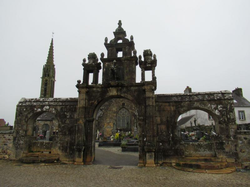 Une grande arcade centrale en plein cintre, avec de part et d'autre deux arcades latérales, est entourée de lanternons, colonnes cannelées, clochetons à boules qui décorent l'entrée de l'enclos paroissial.