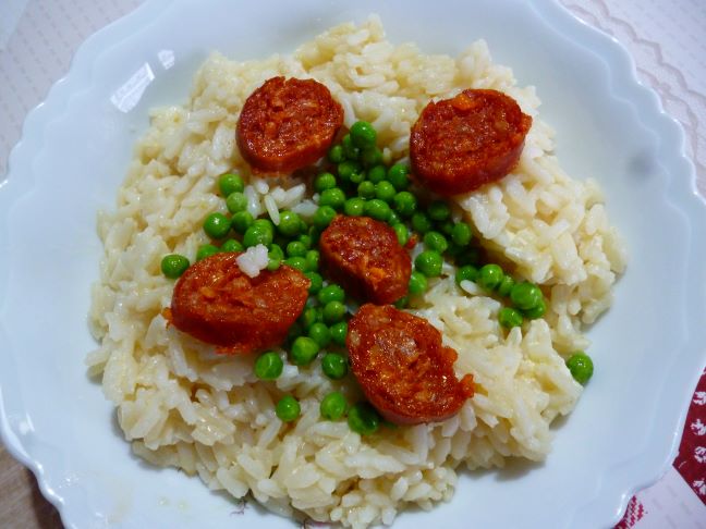 (4 personnes - préparation 10 minutes - cuisson 20 minutes) -300g de riz à risotto -une dizaine de tranches fines de chorizo -100g de petits pois (congelés pour moi) -2 bouillons cube préparés avec 1l d'eau -1 oignon pelé, lavez et finement ciselé -20 cl de vin blanc -1 càs de mascarpone -60g de parmesan râpé -beurre, huile d'olive