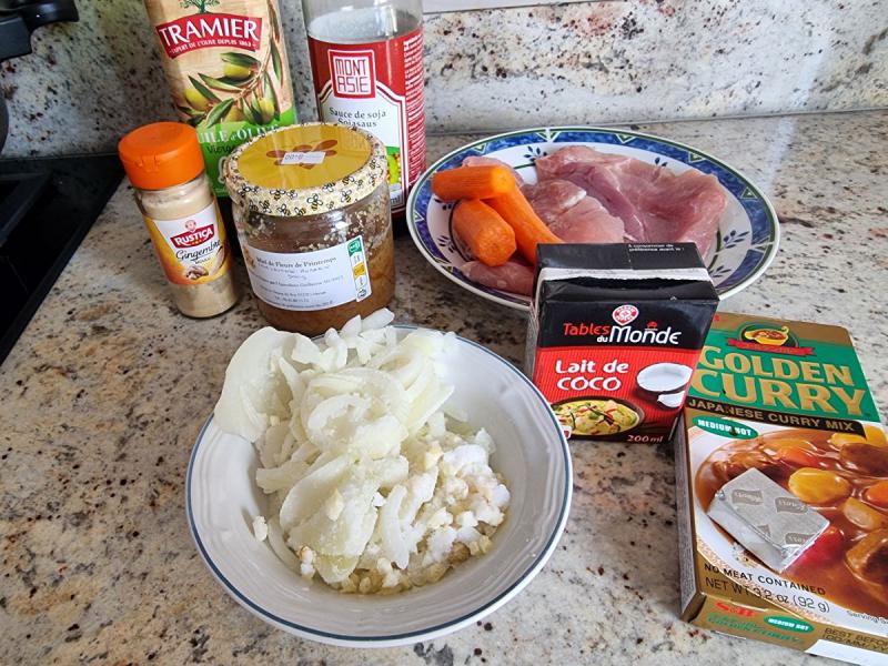 (4 personnes - préparation 20 minutes - cuisson 30 minutes environ) -oignons, ail -beurre, huile -1 carotte -gingembre en poudre -400g d'escalopes de porc -1 jus de citron Pour la sauce: -25cl de bouillon cube -1 càc de miel -1 càs de sauce soja -1 carré de curry roux japonais (trouvé chez notre épicier préféré) -20cl de lait de coco ![]() Pelez, lavez et hachez oignons et ail.