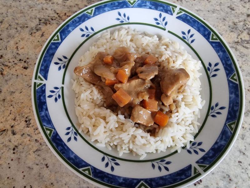 Pelez, lavez et coupez la carotte en brunoise. Prenez une cocotte et faites-y chauffer un peu de beurre avec un filet d'huile d'olive. Faites colorer oignon et carotte. Ajoutez les escalopes coupées en lamelles. Saupoudrez de gingembre, ajoutez l'ail. Faites revenir 5 minutes. Incorporez le lait de coco et le bouillon cube. Ajoutez la sauce soja, le miel et le curry roux. Mélangez. Couvrez et laissez mijoter 15 à 20 minutes jusqu'à ce que la viande soit cuite. ![]() J'ai servi le curry accompagné de riz! Bon appétit !