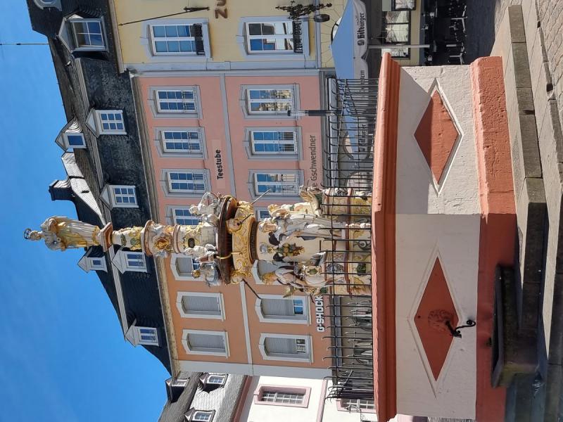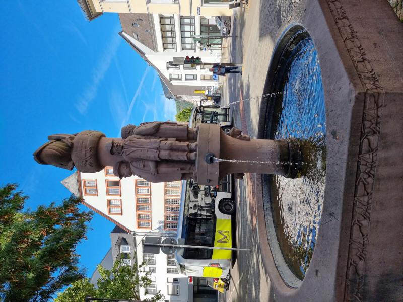 Située sur la place du marché de Trèves, la maison a été construite en 1684 par le maître d'œuvre Wolfgang Stuppeler pour le secrétaire de la cathédrale Johann Wilhelm Polch. Elle abrite actuellement un café. Directement à gauche de la Maison Rouge, il y a un glockenspiel sur la façade de la maison qui sonne toutes les heures. ![]() La fontaine du marché, qui date de 1595, est couronnée par St Pierre, le Saint Patron de la cathédrale et de la ville.