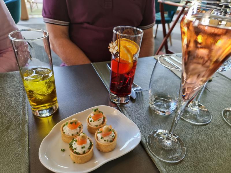 Le temps de l'apéritif, nous consultons les menus. Cela nous permet de goûter à un amuse-bouche tout à fait délicieux, une bouchée crème menthe et aneth, gravlax de saumon, purée pêche romarin.
