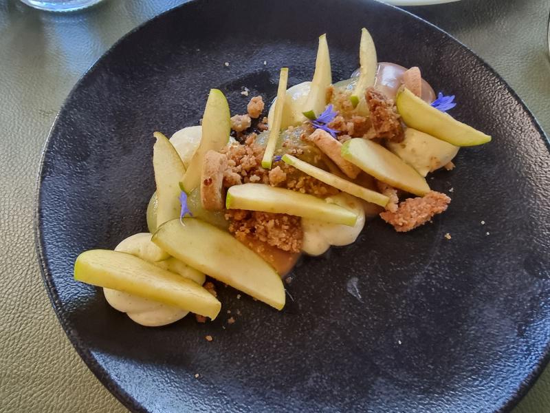 Biscuit pécan, caramel beurre salé, vanille et pommes caramélisées.