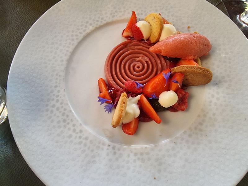 Confit framboise, crémeux fruits rouges, gel basilic espuma yuzu basilic, sorbet fraise basilic.