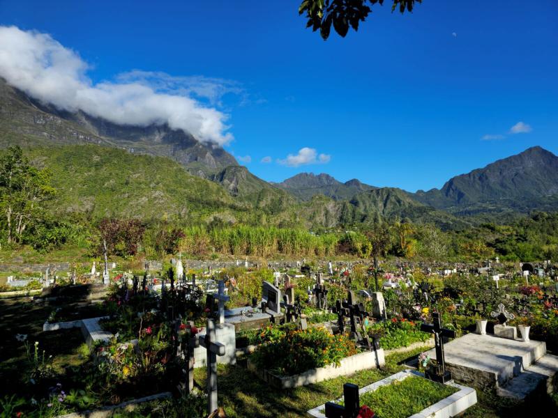 Volcenay Zitte se trouve être un célèbre bandit sanguinaire, qui a terrorisé les Réunionnais en 1919. Il sévit dans les hauts de Saint-Paul, à la Possession et à Saint-Denis, en s’introduisant dans des cases pour voler. On lui prête de graves méfaits, dont des viols et assassinats. Le fugitif est finalement arrêté chez sa sœur à Marla dans le cirque de Mafate. Un guet-apens a été tendu mais Volcenay Zitte ne sera pas ramené vivant. Durant le trajet pour l’escorter hors du cirque, Volcenay Zitte se suicide et meurt à Grand Sable. ![]() Fleuri et pittoresque, le cimetière offre une superbe vue sur le piton d'Anchaing.