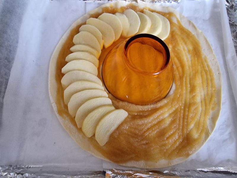 Placez un bol au milieu. Badigeonnez tout le tour de compote de pommes.