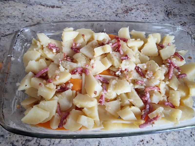 Étalez une couchez de pommes de terre et recouvrez d'une partie des lardons.