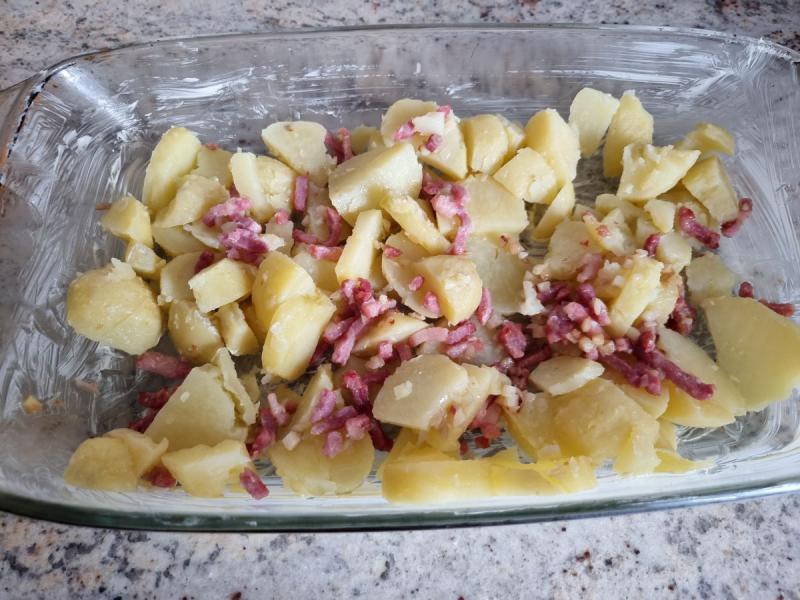 Recouvrez du reste des pommes de terre et du reste des lardons.