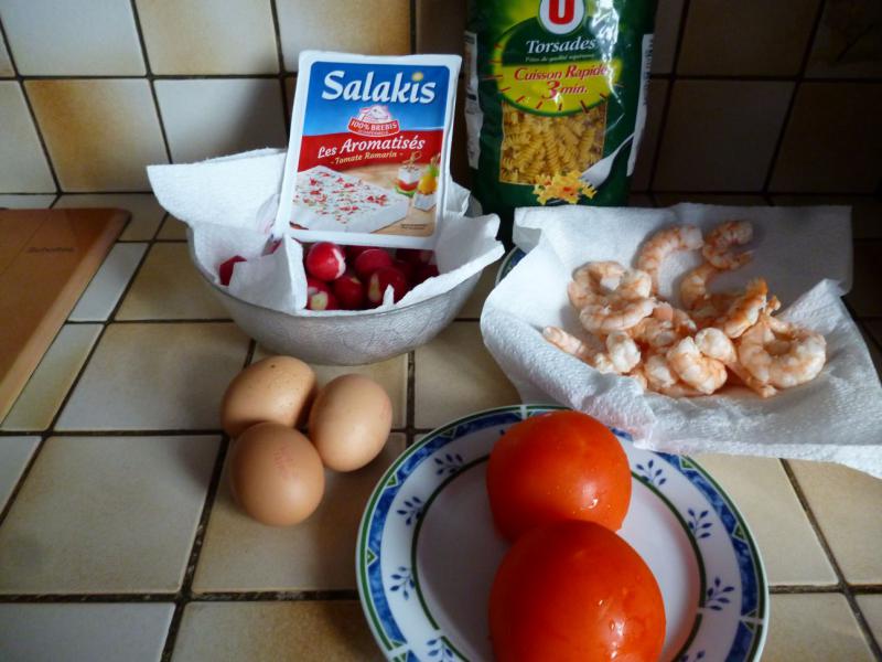 Aujourd'hui, je cuisine une salade de pâtes, radis, crevettes, tomates et dés aromatisés de fromage grec.