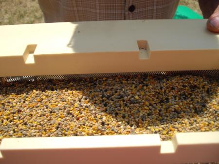 Lorsqu'elle entre dans la ruche, l'abeille passe en premier lieu par les petits trous puis par une grille qui fera tomber le pollen dans ce tiroir.