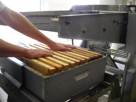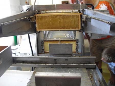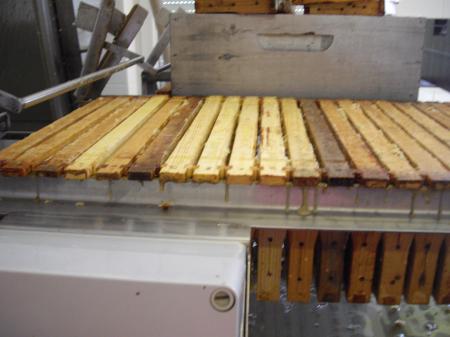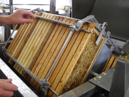 Les cadres passent dans une centrifugeuse qui fait jaillir le miel des cadres.