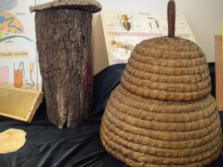 Voici deux types de ruches anciennes, une structure tressée, et une creusée dans un tronc mort.