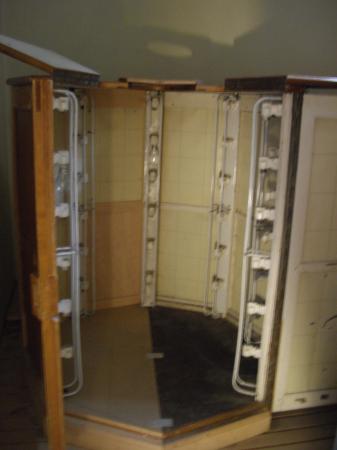 Le poste de douche où le patient, souffrant de rhumatisme ou de goutte, se tenait à la barre et recevait des jets d'eau dans le dos.