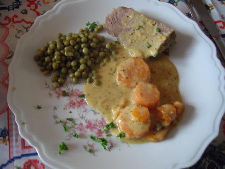 En cuisine, le veau se décline de multiples façons. Aujourd'hui, je vous présente le rôti de veau aux trois moutardes. Les ingrédients pour cette recette: -1 rôti de veau de 1 kg -5 carottes -2 ou 3 gousses d'ail -1 oignon -1 bouquet garni -2 càs de crème fraîche -beurre -30cl de vin blanc -2 càs de moutarde à l'ancienne -1 càs de moutarde au poivre vert -2 càs de moutarde à l'estragon -huile d'olive -1 càs de sucre en poudre -sel, poivre En ce qui concerne les moutardes, j'ai utilisé les moutardes Fallot de Beaune (voir le lien). Piquez le rôti de bâtonnets d'ail.