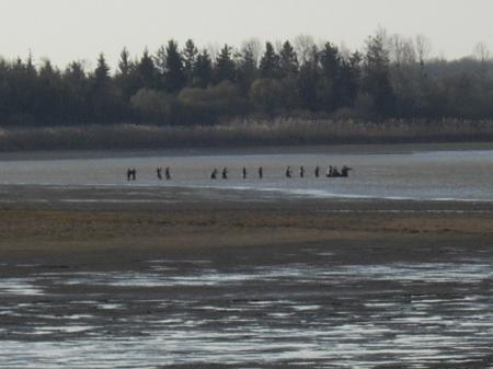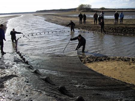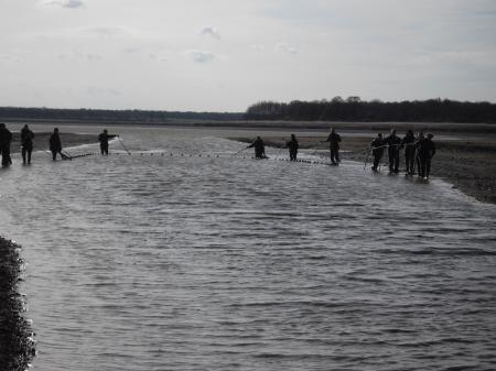 Les pêcheurs sont partis depuis 8h le matin mettre le filet au milieu de l'étang et le ramènent jusqu'à la rive par un chenal creusé à cette intention.