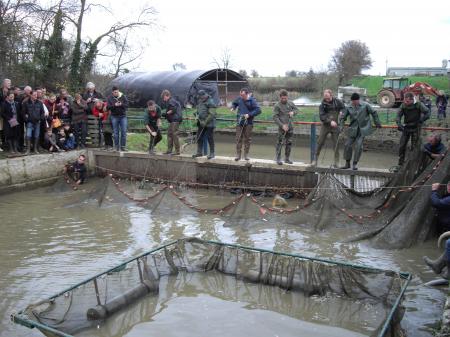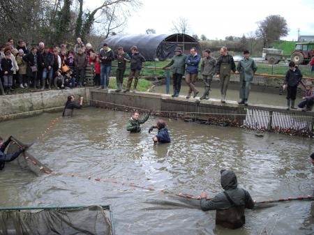 Une fois dans le bassin, les poissons sont tirés à l'aide d'un filet...