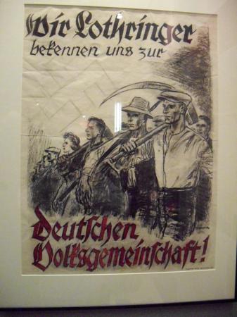 Sur cette affiche, on voit l'armée française présentant les armes, les dames de la Croix Rouge d'un côté et les Mosellans de l'autre, heureux d'être libres mais désemparés avec leur baluchons.