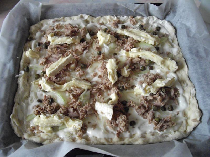 Coupez l'oignon en fines lamelles et mettez-le par-dessus. Étalez le thon et les câpres. Ajoutez le camembert en dernier.
