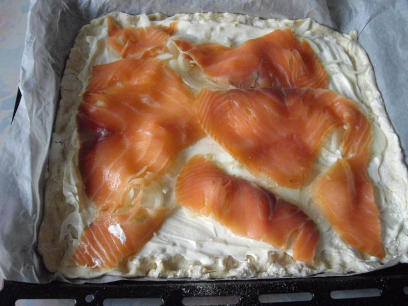 Coupez les oignons en lamelles et parsemez-en la crème fraîche. Mettez le saumon fumé par-dessus. Parsemez votre flamme de câpres. Mettez la flamme dans le four 220° 20 à 30 minutes.