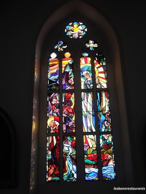 Ce vitrail représente l'apparition de la Vierge à Pontmain en Mayenne. Celui-ci représente l'apparition de la Vierge à Lourdes.