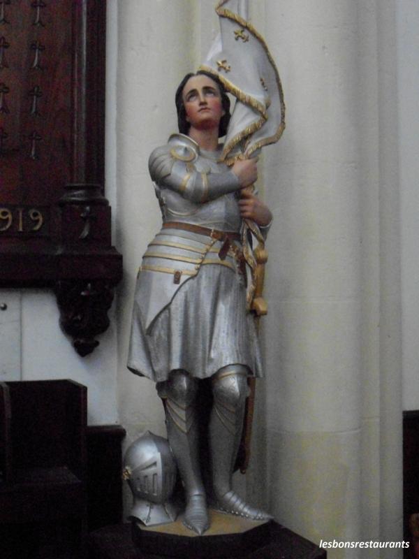 Le peuple, à genoux, reçoit la bénédiction de l'évêque Saint-Germain d'Auxerre. De remarquables statues de bois datent du 18e siècle, ici, Jeanne d'Arc.