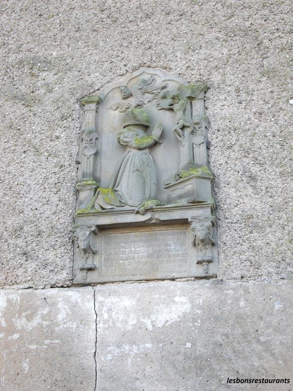 Le premier arrêt se situe non loin du lavoir, à l'intérieur d'une cour de ferme. Un linteau de porte, découvert sur la propriété a été intégré dans un des murs de construction de la ferme. Quelle bonne idée! Il représente Saint Hubert, patron des chasseurs, tombant à genou devant un cerf. Ce linteau date de 1698. Ce bildstock est le calvaire du cimetière et date de 1820.