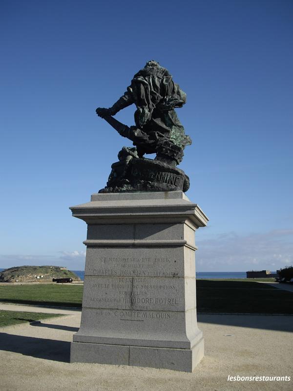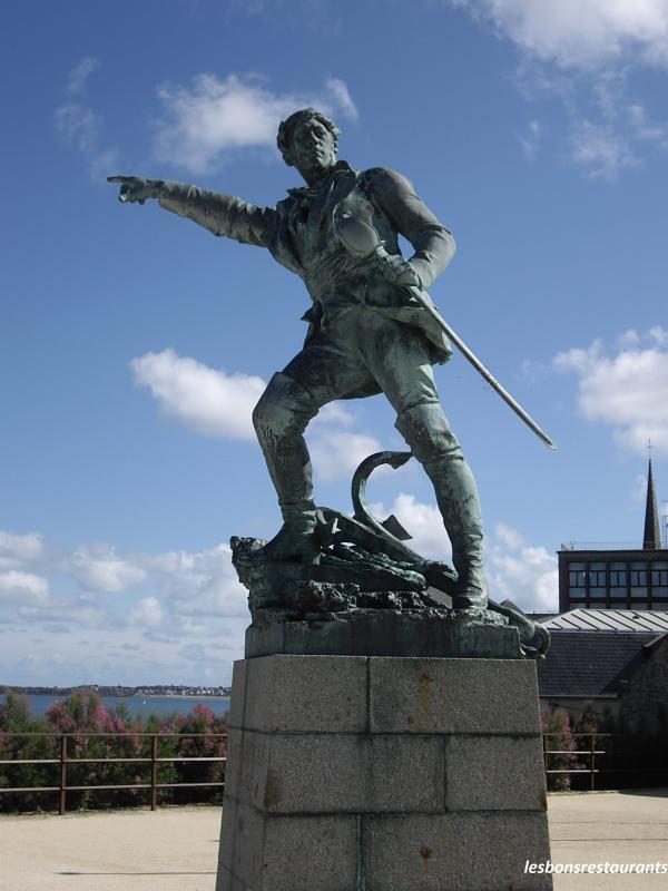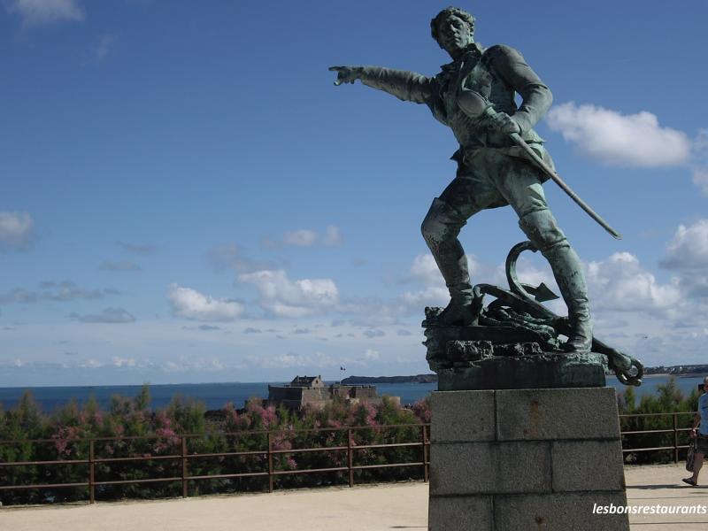 La balade commencée sur les remparts (voir le lien) continue. Peu de ville ont vu naître autant d'hommes célèbres. Nos pas nous ont amené à admirer de superbes statues représentant ces hommes qui ont marqué l'histoire. Surcouf! Surcouf est l'un des plus illustres corsaires malouins. Ce hardi marin recevait du roi des "lettres de course" qui lui permettait d'attaquer les navires de guerre sans être traité de pirate. Cliquez sur les photos pour les agrandir. Surcouf, né en 1773, embarque dès l'âge de 13 ans comme mousse et participe à la guerre de course contre le commerce anglais dans l'Océan Indien.