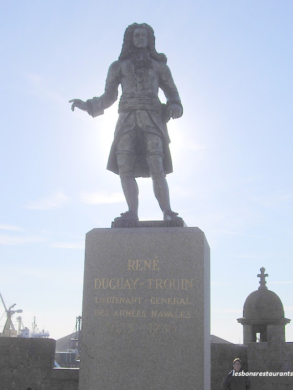 René Duguay-Trouin! Né en 1673, Duguay-Trouin, fils d'un riche armateur est destiné à la prêtrise. Il s'embarque pourtant à l'âge de 16 ans sur un navire corsaire. Capitaine corsaire à l'âge de 18 ans, il s'illustre pour le compte de Louis XIV contre les Hollandais, les Anglais et les Espagnols. Il est enterré dans l'actuelle Cathédrale Saint-Vinvent (il y aura un lien d'ici peu). Jacques Cartier!
