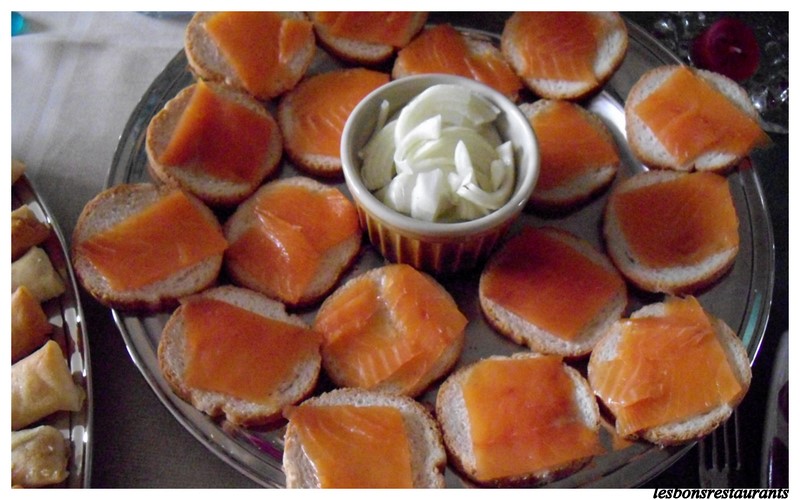 Pour accompagner l'apéritif, des toasts au saumon, présentés avec des oignons.