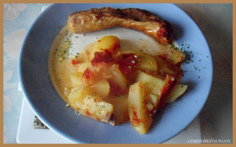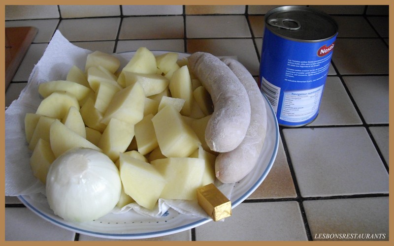 Aujourd'hui, je cuisine les pommes de terre à la sauce tomate et aux saucisses blanches.