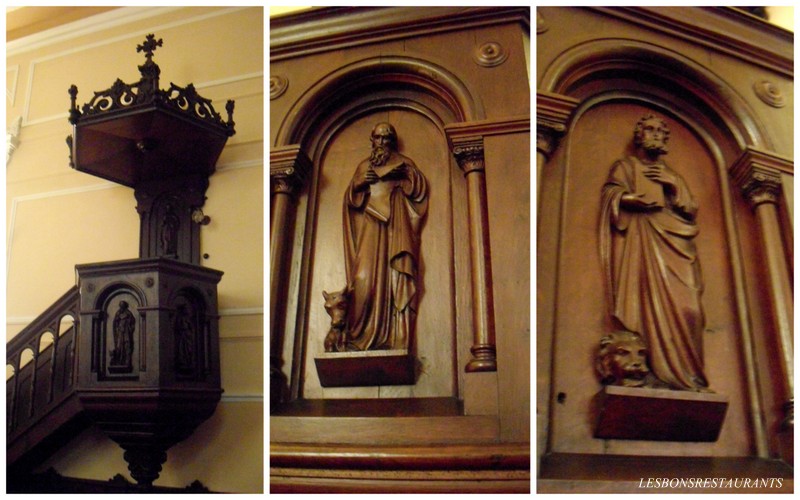 La chair à prêcher est en bois sculpté avec une représentation des quatre évangélistes.