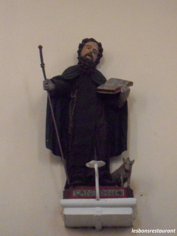 Au pied de la statue, le bovin rappelle que la piété populaire invoquait saint Aubin pour la protection des vaches. On reconnaît saint-Antoine l'ermite par son livre, son bâton, son chapelet et le porc qui l'accompagne souvent.