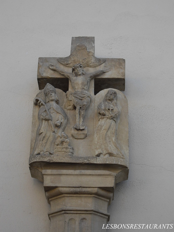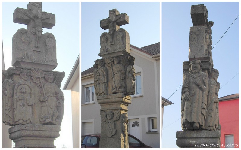 Ce bildstock érigé en 1849 par Nicolas et Cathrine Becker représente la Vierge, saint-Sébastien et saint-Roch.