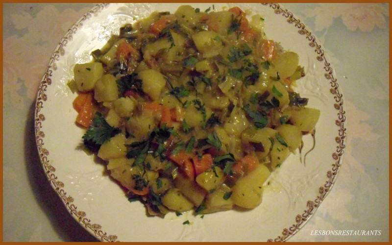 -1kg de pommes de terre -2 carottes -1 ou 2 poireaux -1 oignon -1/2 litre de bouillon -1 càs de farine -laurier, sauge, thym -beurre