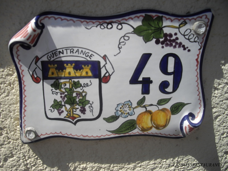 Ces numéros valaient bien un article! On y voit bien sur, la mirabelle de Lorraine, mais aussi une grappe de raisin pour rappeler que c'est un village de vigneron et enfin, les armoiries de Guentrange. Vous pouvez retrouver d'autres "numéros de maison" sur ce lien.