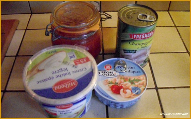 -une pâte feuilletée -1 bocal de sauce tomate maison (voir le lien) -200g de champignons de Paris -100g de crevettes décortiquées -2 càs de crème fraîche -1 goutte de tabasco -1 goutte de worcestershire -persil