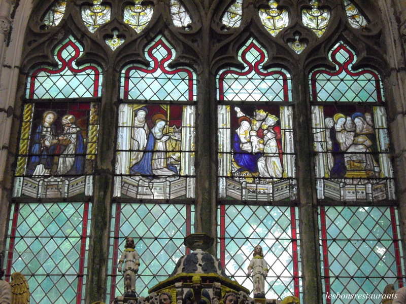 Ce vitrail à quatre panneaux représente des scènes d'enfance du Christ et date du 15e siècle.