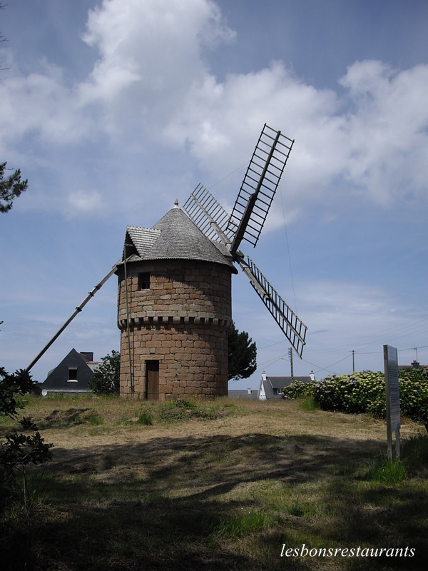 Le moulin à vent du Crac'h. Ce moulin date de 1727 et est bien représentatif des moulins que l'on trouvait dans cette partie de la Bretagne. Son toit est couvert de lauzes et sa charpente tourne sur 360° afin d'orienter les ailes au vent.