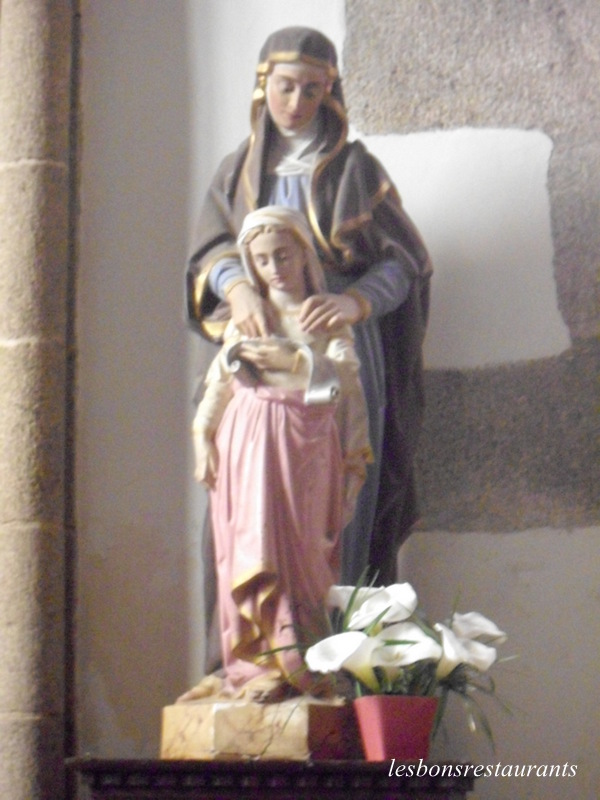 Église que nous avons visitée lors de notre dernier voyage en Bretagne. Aujourd'hui, nous allons poursuivre notre visite en vous faisant découvrir quelques statues ainsi que de magnifiques vitraux. Suivez-nous, la visite continue! Cette statue représente sainte-Anne, la mère de Marie, et Marie enfant. Cliquez sur les photos pour les agrandir! Ici, vous avez une représentation de saint-Éloi.