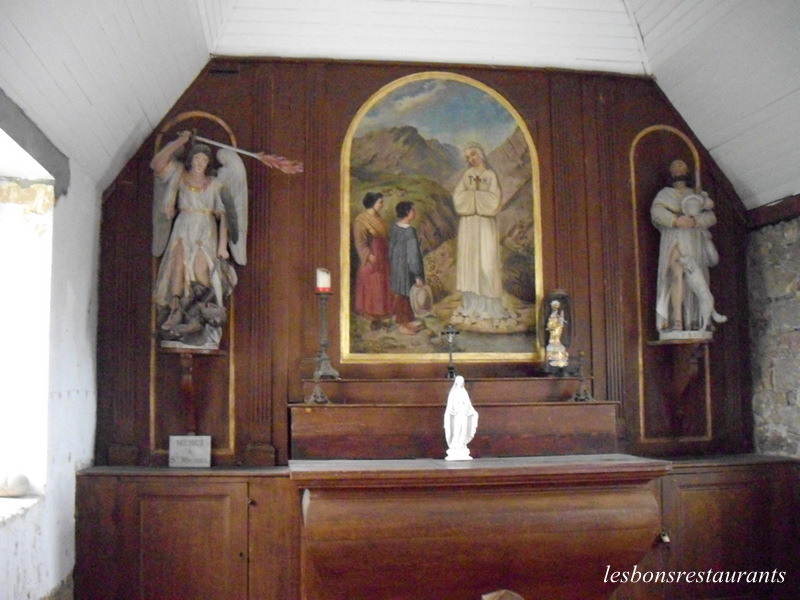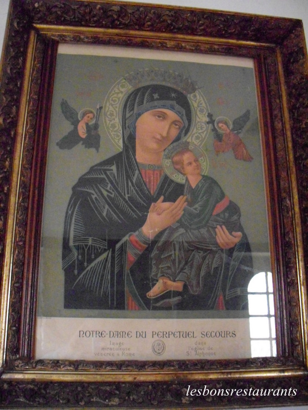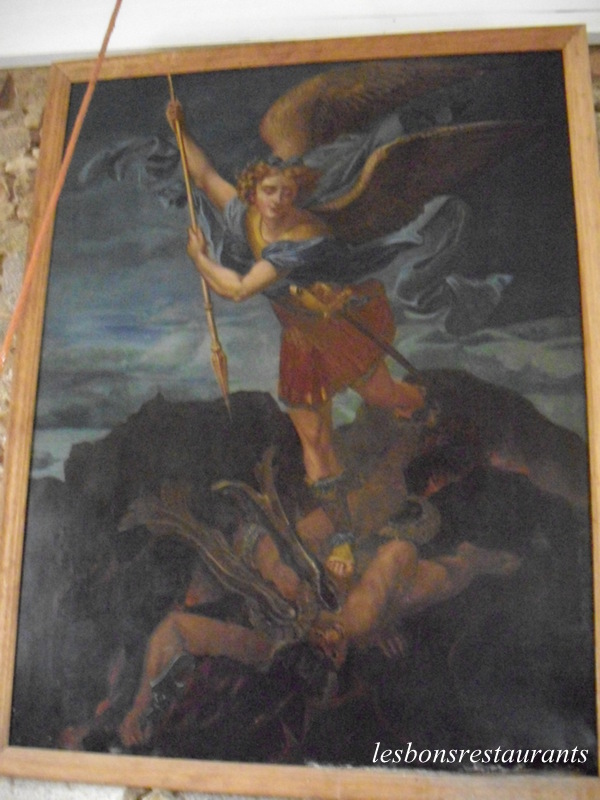 À notre entrée, nous sommes attirés par ce très beau tableau représentant l'arcange Michel terrassant le dragon! Un petit autel sur un pan de mur!