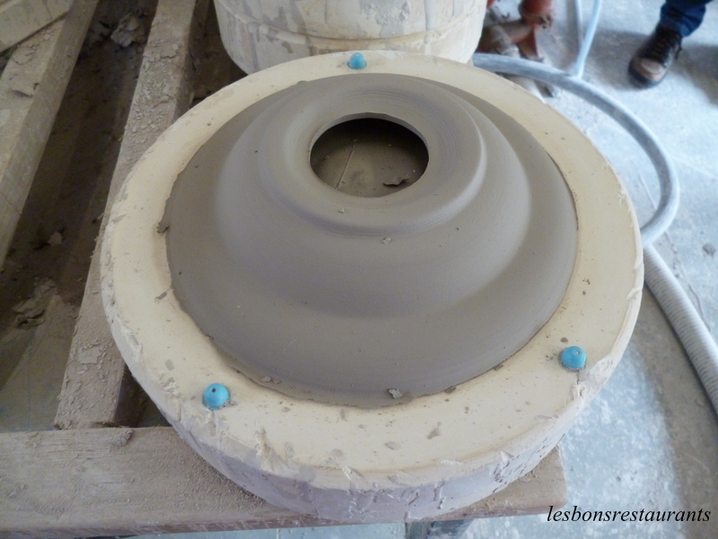 Une croûte se forme le long de ses parois. Dès que l’épaisseur de la croûte atteint 7/8 mm on le retourne, vidant le trop-plein de barbotine encore à l’intérieur. La pièce sèche alors dans le plâtre pendant 4 à 5 heures, puis est démoulée et laissée à l’air libre pendant 24 heures.