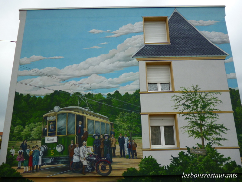 Cette commune est située dans le département de la Moselle en région Lorraine. Un petit rond point au centre du village, juste à côté du château...et un artiste peintre...Greg Gawra! Le résultat est 4 superbes fresques murales représentant des scènes de la vie du village au temps de nos grands parents! Souvenez-vous: -Fresque 1: La vie d'un village (voir le lien) -Fresque 2: Mémoire rurale (voir le lien) -Fresque 3:Près de la terre (voir le lien) Le quatrième volet de ces fresques marque le début d'une nouvelle ère...le progrès s'installe....