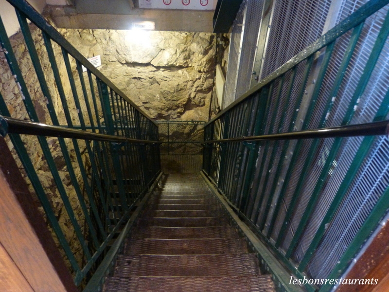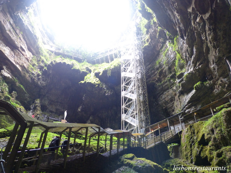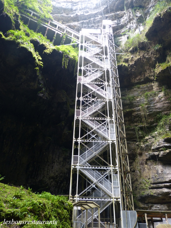 Nous n'étions pas encore entrés dans le site proprement dit que nous nous sommes arrêtés devant cet immense puits vertigineux, visible de l'extérieur (voir le lien)! Aujourd'hui, je vous propose d'entamer, en notre compagnie, la descente de ce puits! Vous êtes prêts pour la suite de notre voyage? Vous pouvez voir ou revoir nos vacances dans le Lot depuis le début en cliquant sur ce lien. Cliquez sur les photos pour les agrandir! Afin d'accéder aux galeries, souterraines, des ascenceurs et des escaliers sont aménagés le long de la paroie.