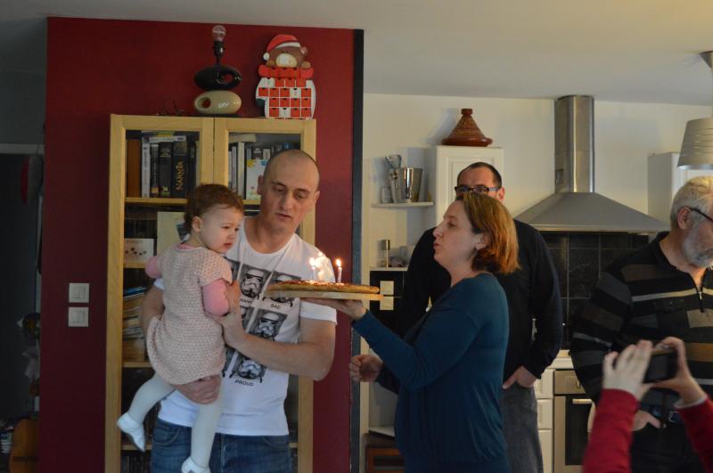 puis on souffle la bougie 2 seulement pour Alyssa car pour papa qui fête aussi un an de plus on le fera après et comme on est à la Chandeleur c est bien évidemment une galette qui sera le support de la bougie