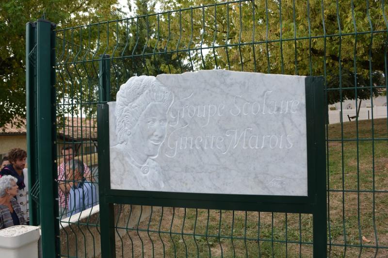 Début septembre, la Conseil Municipal de ma petite commune avait décidé de donner un nom à l école du village qui regroupe les enfants des 4 communes limitrophes le projet a donc été porté depuis plus d un an et on arrivait à l étape finale tout d abord il a fallu lui trouver un nom le choix s est porté sur une jeune institutrice qui avait été nommée après l obtention de son diplome et qui part ailleurs a fait partie du réseau de la Résistance local - après accord de la famille le travail a pu commencer il a été fait appel à un sculpteur de pierre local (un jeune qui avait été copain de foot de mon fils d ailleurs et qui a une belle renommée) et à partir du portrait de la jeune femme il a réalisé la plaque - travail qu il effectuait lors d expo auquelles il participait d' où j ai pu obtenir cette photo d ailleurs