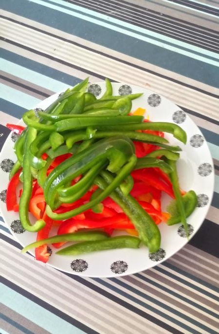 Puis j émincé mes poivrons des 3 couleurs ainsi qu un piment vert que j avais au frigo