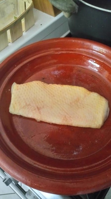 Étape 1- j ai sorti la graisse de mon magret que j ai mis doucement à fondre dans mon plat à tajine