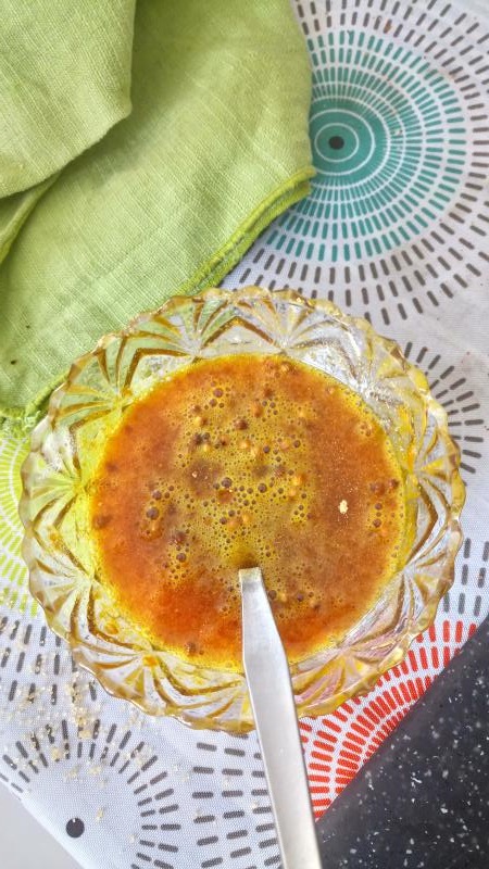 Pendant ce temps j ai préparé ma sauce avec tous les épices curcuma gingembre cirruabdre sucre roux (je n avais pas de cassonade) sel poivre avec le miel (du mille fleurs que j avais ramené de mon voyage en Italie)