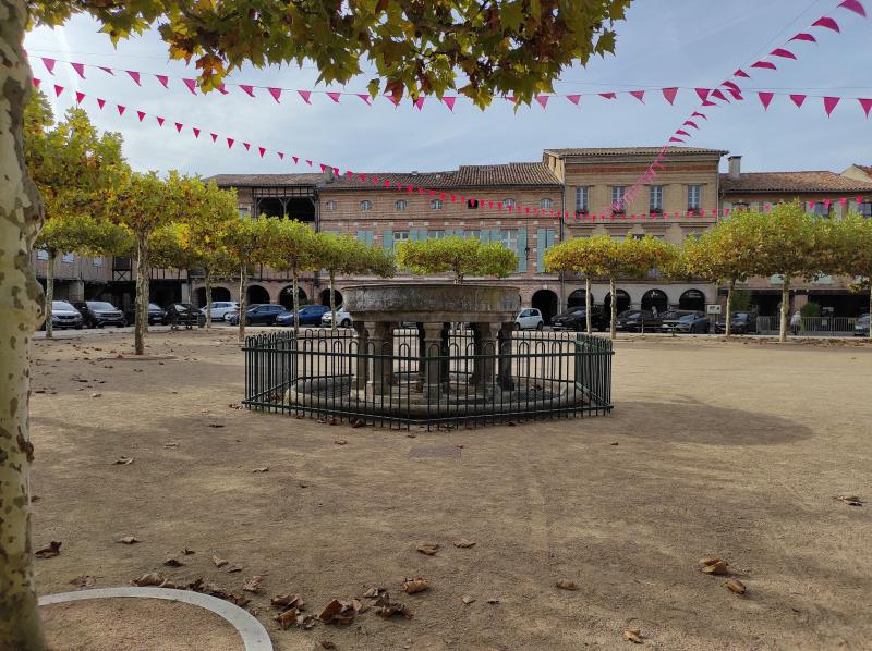 sur la belle place centrale avec tout autour de belles arcades toutes en pierre de pays colorées en rose