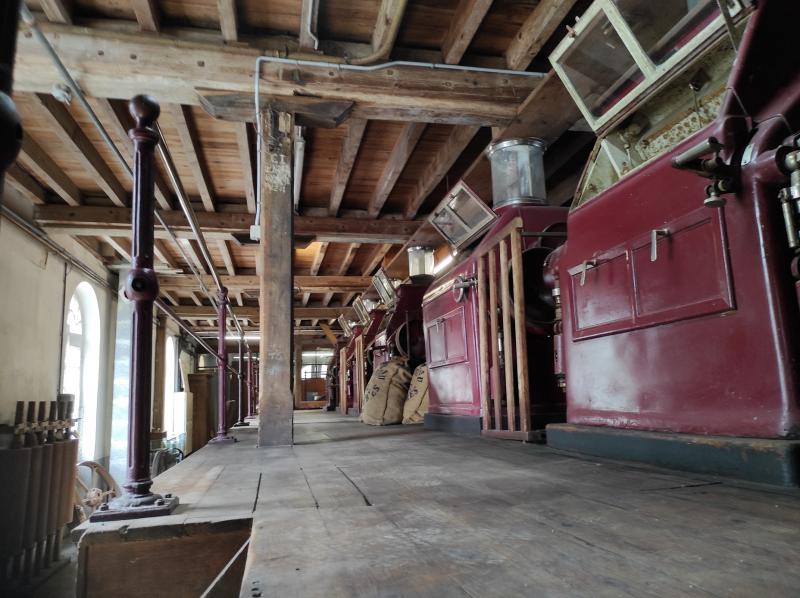 la visite commence par le hall qui abritait autrefois la livraison du grain et ensuite l expédition des sacs de farine obtenus - une belle exposition de tous les sacs qui ont pû transiter par ce lieu lors de la livraison qui ont été retrouvés lors de la remise en état